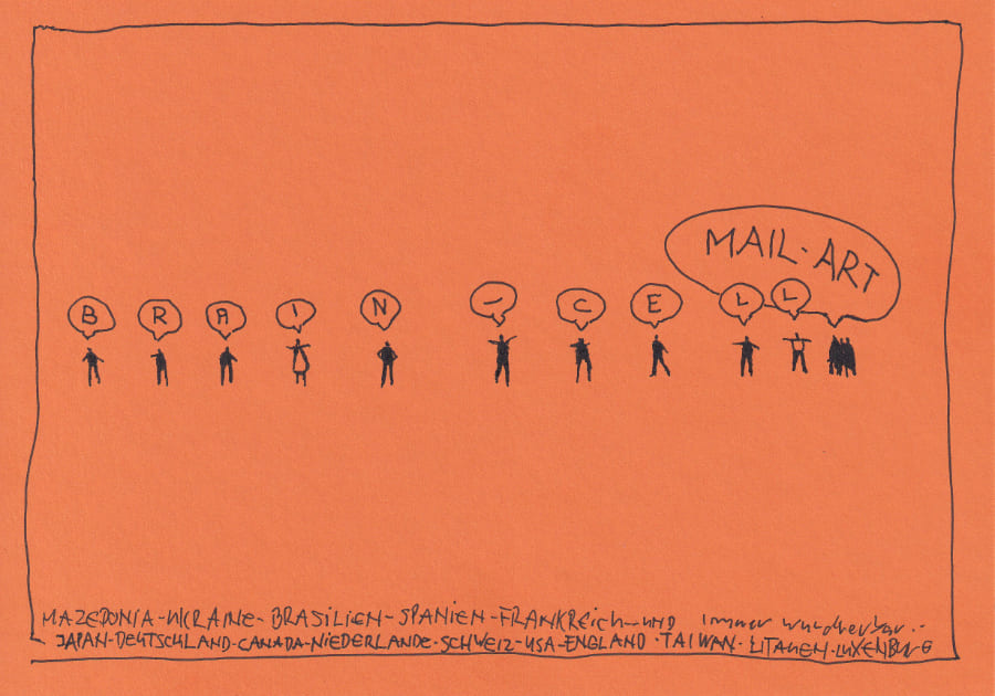 Die Illustration zeigt in einem minimalistischen Stil verschiedene kleine Figuren, die, die einzelnen Buchstaben von Brain Cell in einer Sprechblase sagen, sowie den Begriff -MAIL ART- in einer Sprechblase, alles vor einem orangefarbenen Hintergrund. Postkarte Mail Art Arte Postale