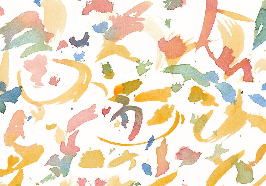 Der Hintergrund ist weiss, was dazu beiträgt, dass die Farben der Pinselstriche gut zur Geltung kommen und ihre Lebendigkeit unterstreichen. Die Lichtverhältnisse sind diffus, ohne spezifische Schatten oder Lichtquellen. Dies unterstützt die fliessende und lebendige Atmosphäre des Bildes. Das Fehlen von detaillierten Elementen und die Verwendung von weichen Übergängen schaffen eine Atmosphäre der Ruhe und des Friedens.