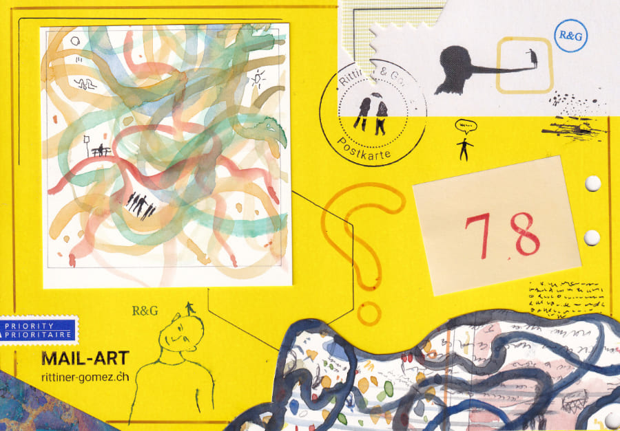 Bunte Postkarte mit abstrakter Malerei und Stempeln - Postkarte Mail Art Arte Postale