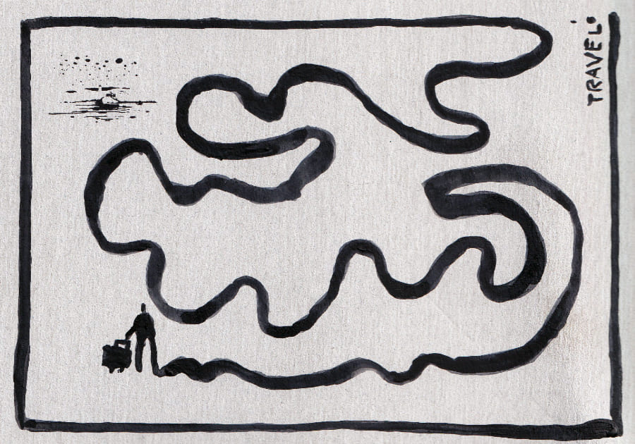 Eine minimalistische Tuschezeichnung zeigt eine einzelne Figur mit einem Koffer am Anfang eines verschlungenen Pfades, einer Reise. - Postkarte Mail Art Arte Postale